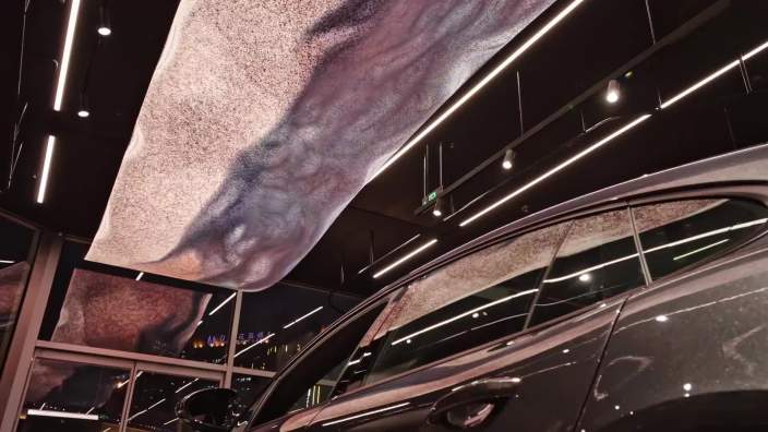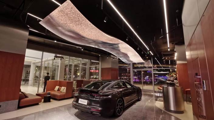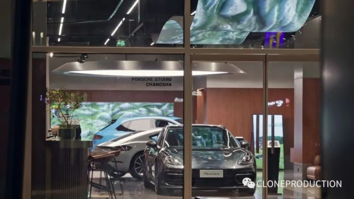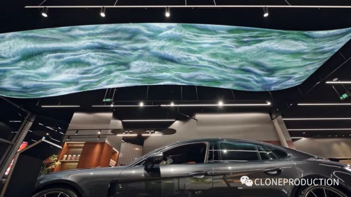 长沙保时捷e享空间2.0(Porsche Studio Changsha 2.0)2023年2月27日正式落地城市热点商区,零售空间转变为品牌体验空间,以数字艺术来塑造独具本土适应性的多维零售体验空间。CloneProduction为空间设计了多层维度的数字艺术,借纹理、形态和光影的语言将虚拟世界融合于现实空间,创建着艺术品牌接触点。数字画面全部采用实时渲染与使用预定义的规则算法,创建不间断不重复的数字场景的演变,光影流动的数字艺术点亮汽车,为其在此闪耀增添一丝“魔力”,唤醒梦想的驱动力。数字化视觉与LED显示屏幕的结合,最终形成了曲面数字艺术雕塑完整的艺术表达。兼具趣味性与功能性互动多媒体系统,支持空间举办各式活动。