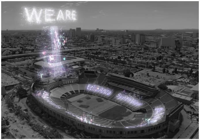 2024年9月15日,由蔡国强以及他量身开发的AI模型cAI™共同创意的白日焰火《WE ARE:为PST ART所作爆破计划》在洛杉矶纪念体育场奥运圣火台上喷射而出,在天空中留下“WE ARE”的字样。这是全球首场AI日景烟花,也是美国史上首次大规模白日焰火及无人机带烟花编队表演。人工智能全面参与了这场烟花的设计,包括创意设计、燃放编排、效果呈现等。50000发白日焰火、1300架无人机、4000根竹竿、近万颗爆花,在30余分钟之内构造了一场人工智能与人类对话的盛大奇观。自2017年开始,蔡国强及其团队开始涉猎人工智能研究,并以蔡国强为个人模型,定制化开发出多模态的人工智能模型cAI™。从开始研究、磨合、到现在人工智能模型几乎能够独立完成一组作品,团队用了5年时间探索艺术和科技结合。火光连接历史与未来,绽放出人类与自然的共鸣。