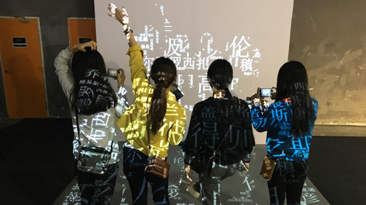 当观众走近时,地面上被影子遮挡的文字以观众身体外轮廓的形式出现在正面的白墙上,并实时模仿着观众的动作。