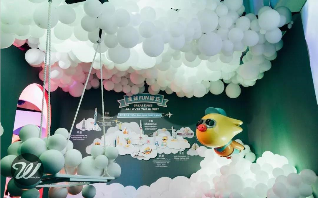 玩疯了的筋斗云代表飞猪,观众坐在秋千上轻轻荡一荡,飞猪即可带走你在上海、东京、北京、洛杉矶、巴黎这五城市穿梭。