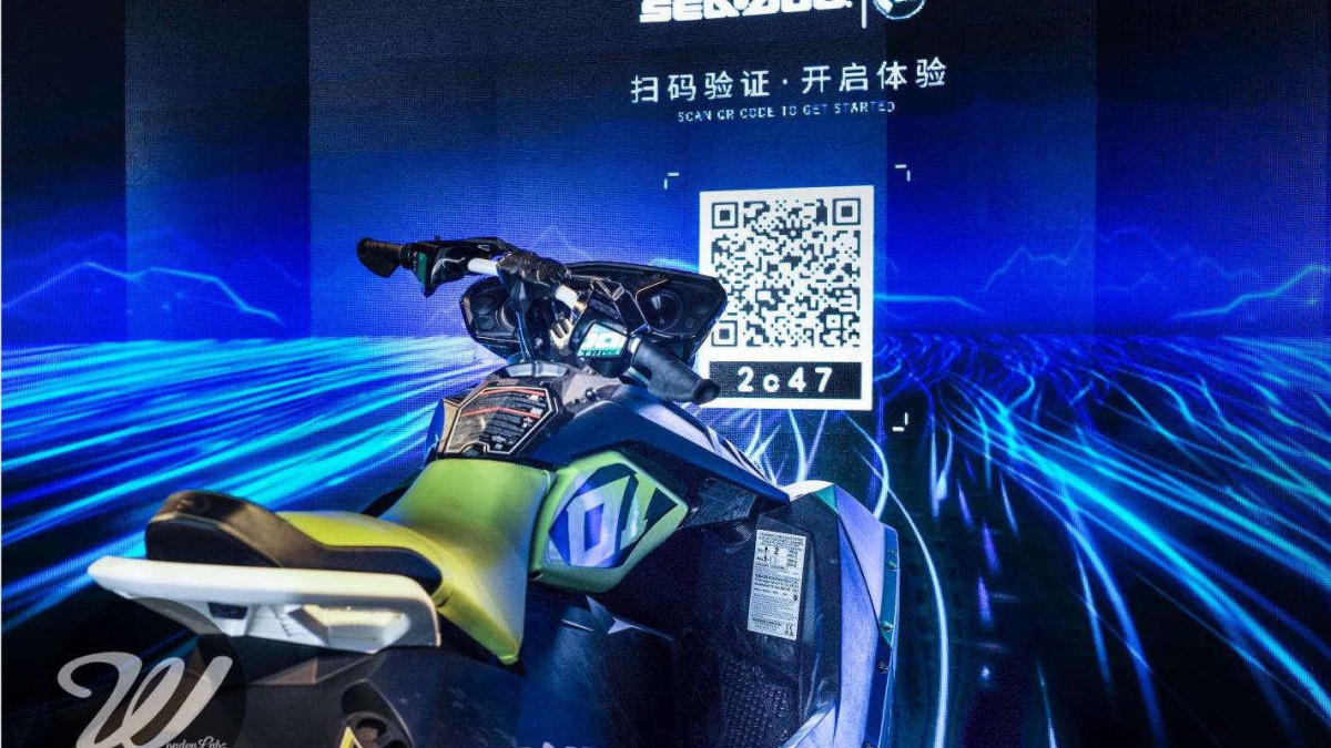 在180度的由粒子组成的空间中,参与者可以坐上改装的摩托艇开启独一无二的沉浸式试驾体验。整个互动游戏通过手机扫码后激活,参与者在游戏中不仅可以学习到摩托艇的操控方式,同时还可以在逼真炫酷的粒子水上世界中体验SeeDoo的驾驶乐趣,游戏中除了在粒子海浪中转向,加速,急刹之外,参与者还能真实感受到速度带来的风。在体验结束后,还可以扫码获得自己驾驶SeeDoo的照片。