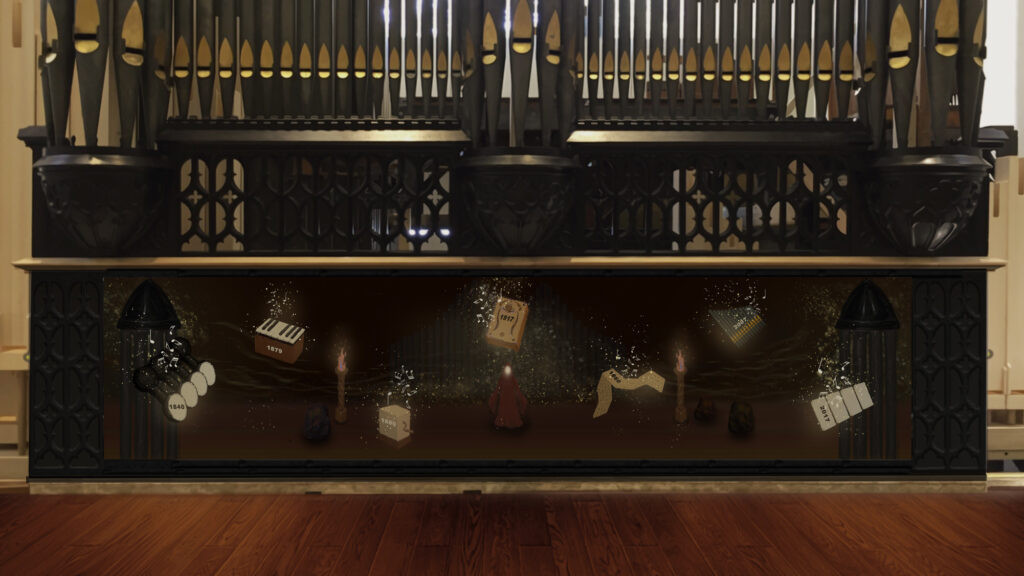 一个魔法师给卡萨翁施魔法,一个咒语,把管风琴的元素分解开,每个元素代表一年份,从左到右依次,音栓、键盘、手摇管风琴、魔法书、空气动力的琴谱、音馆、谐音笛音栓。魔法把所有的元素变成永恒的自动演奏,如果没有人触碰他们永远不能和别人诉说卡萨翁的秘密,要有人来触碰他们才可以把秘密一点点释放出来,最后2017年最后一页把所有的元素结合在一起成为一个卡萨翁相片,和来倾听卡萨翁秘密的人合照,破解魔法让卡萨翁故事流传。