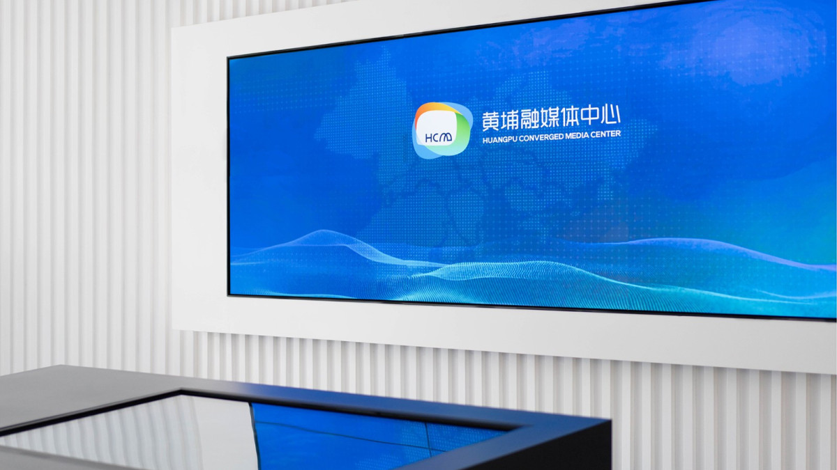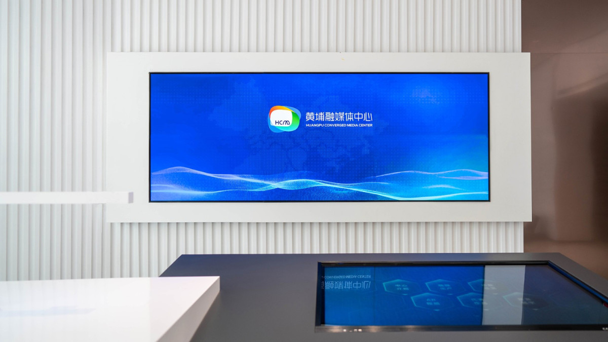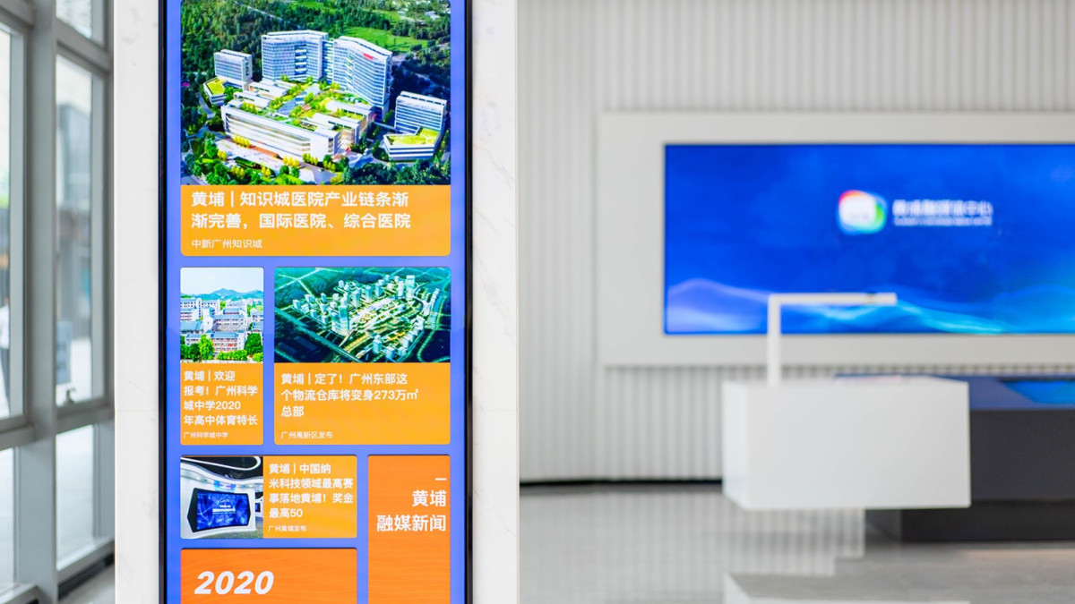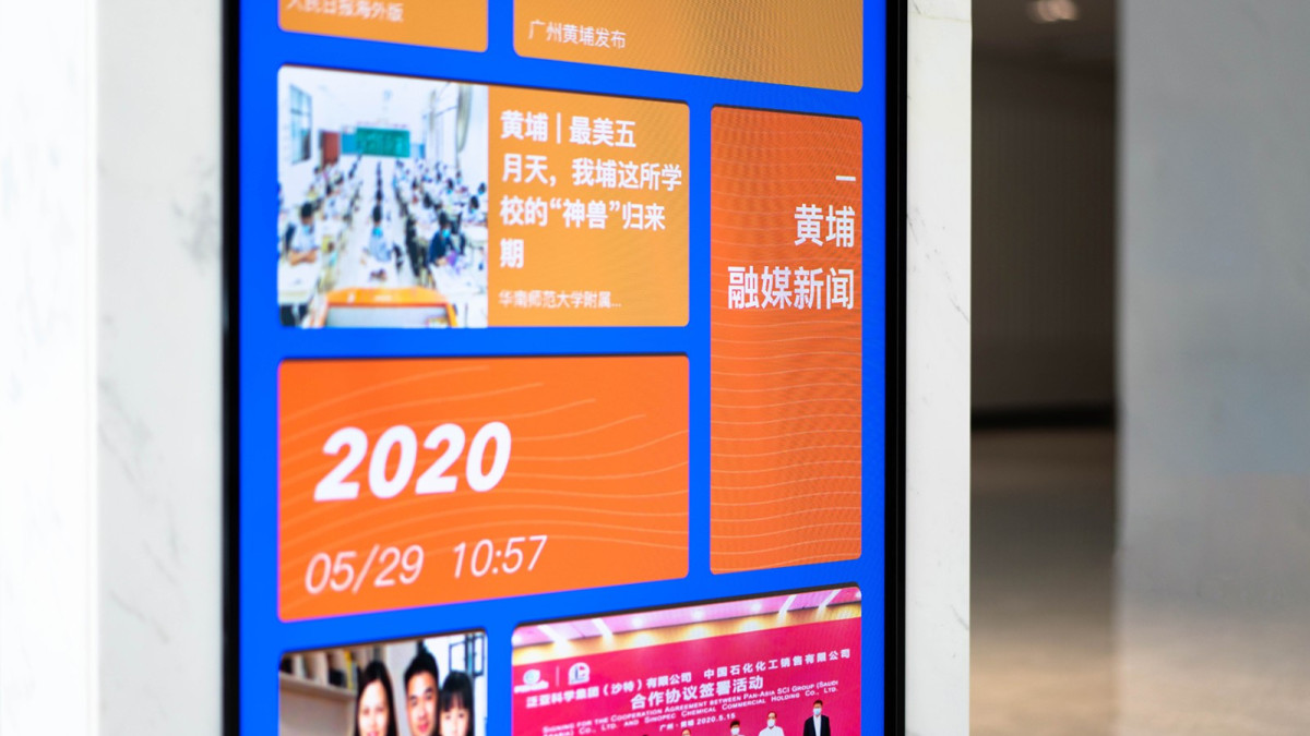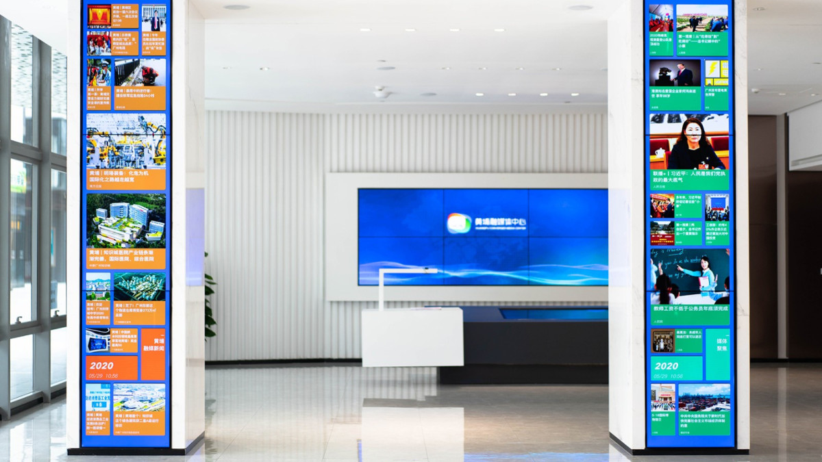 CT.LAB为展厅设计的一系列的数字媒体展示方案。在展厅大堂中庭部分,有4个信息柱实时展示习主席重要新闻、全国热点新闻、黄埔区重要新闻和大湾区重要新闻,信息流以简洁大气的方块排列形式滚动播放,体现新时代党的新闻舆论工作的职责和使命。