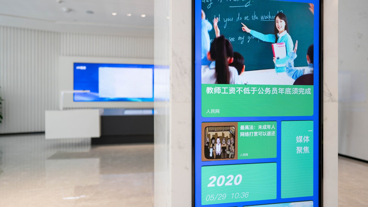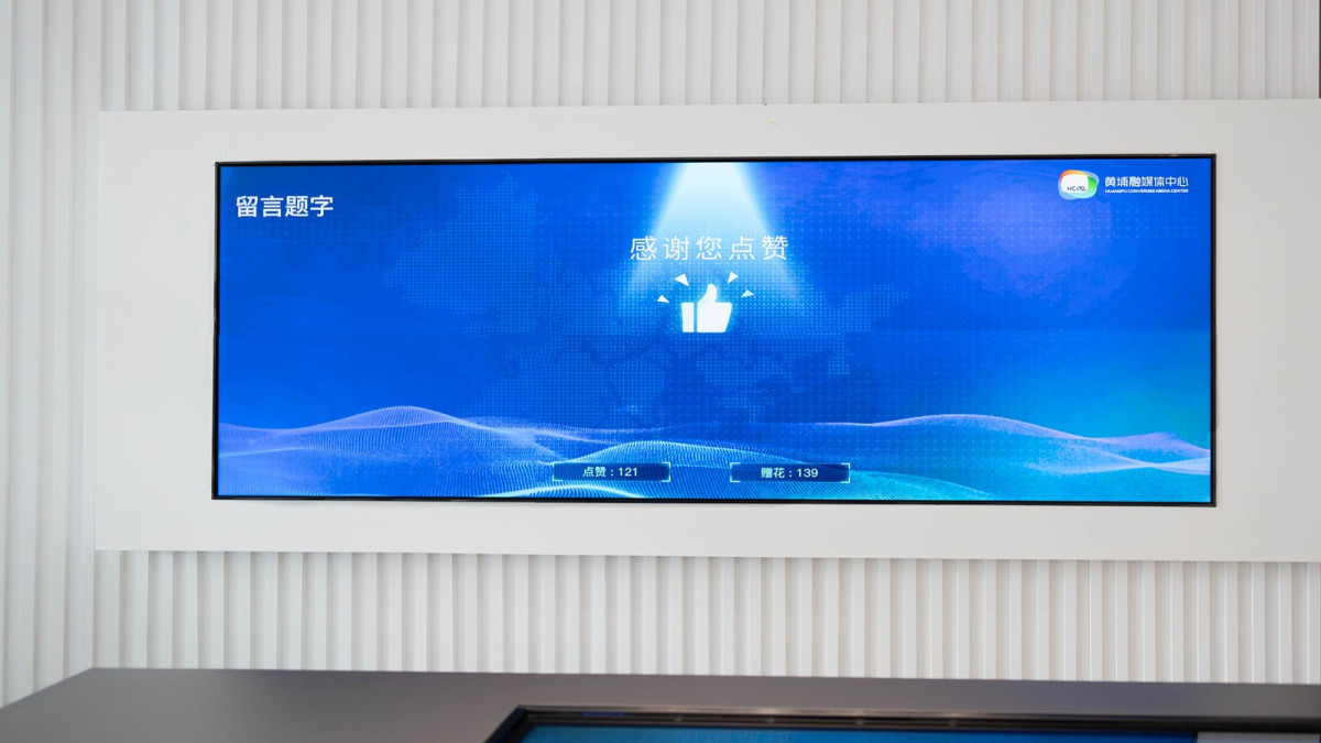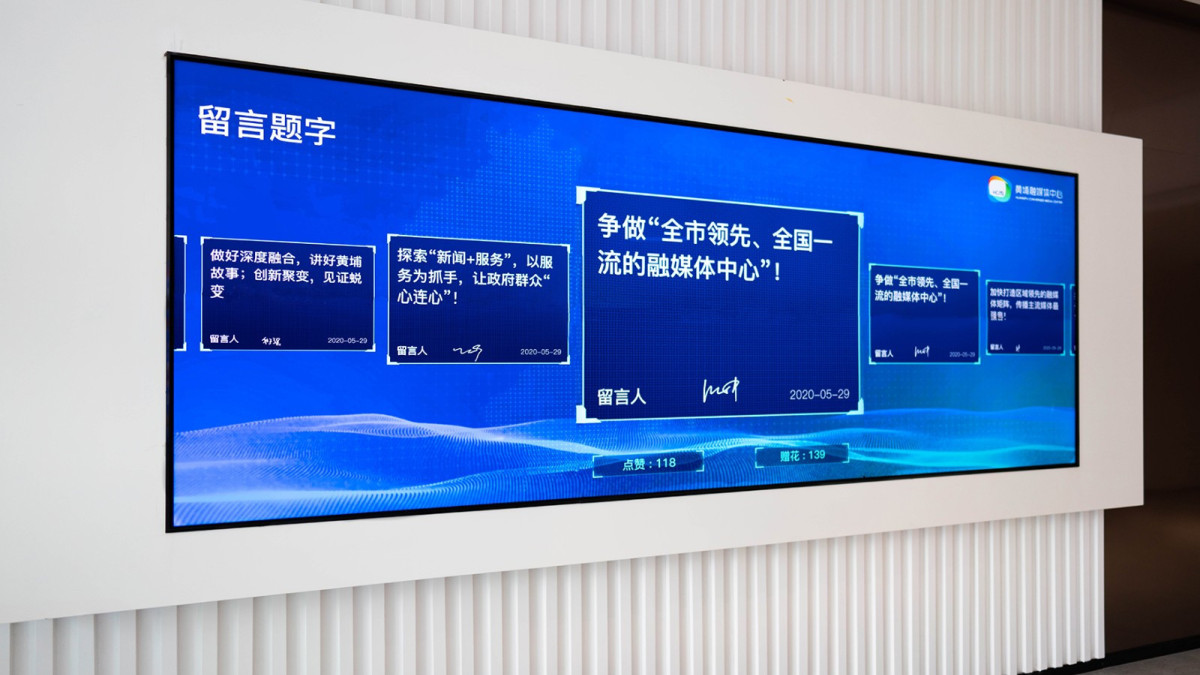 在大堂互动体验区,触摸屏与LED屏联动,参观者可以在触摸屏上点击查看融媒体中心宣传片,也可以点击查看AR报纸查看融媒体“四个十年”宣传片。并且触摸屏加入了互动留言签字方式,让参观者随时上传留言进行互动。