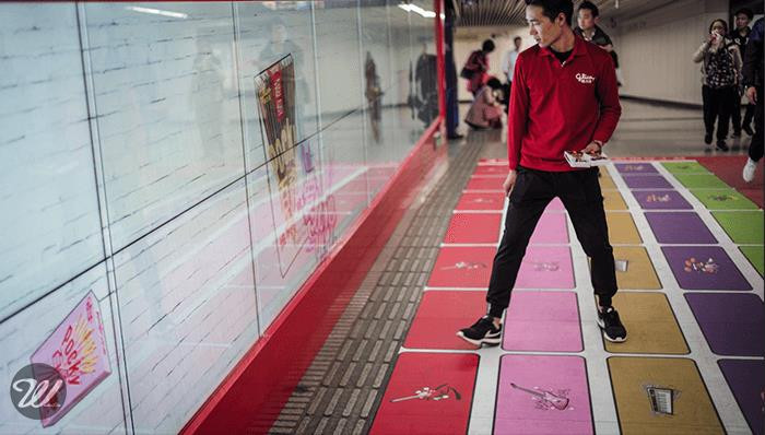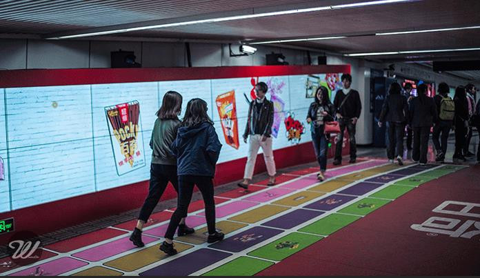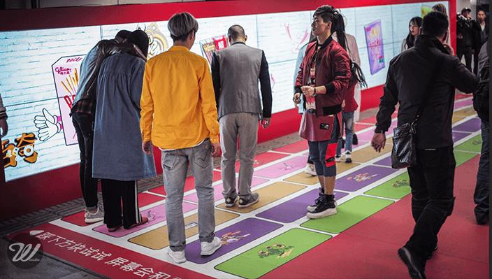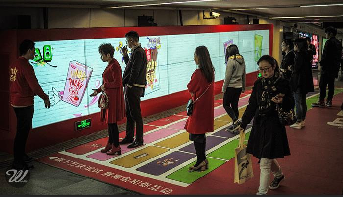 Wonderlabs与Dentsu合作,在上海人民广场15号地铁出口处设置了一面独一无二的互动屏,以“独乐不如众乐”的创意主旨,吸引过往行人一起来畅游Pocky的音乐世界。当来往的行人踏步于色彩明艳的五线谱上,会惊喜地发现互动屏上不时爆出各种生动的百奇元素和音乐元素,且伴随着过往行人越来越多,屏幕内容上的元素越来越丰富,与此同时音乐的不同音轨也得到演绎。
