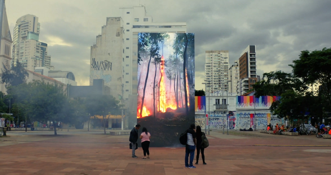 2020年 12月12日 Virada Cultural 文化节期间,米迪亚杜布在巴西的圣保罗巴塔街的一角放置了 一块高8米、宽4米的大型LED面板,并使用3D软件重现了亚马逊雨林,创建了一个被烈火包围的森林地狱。