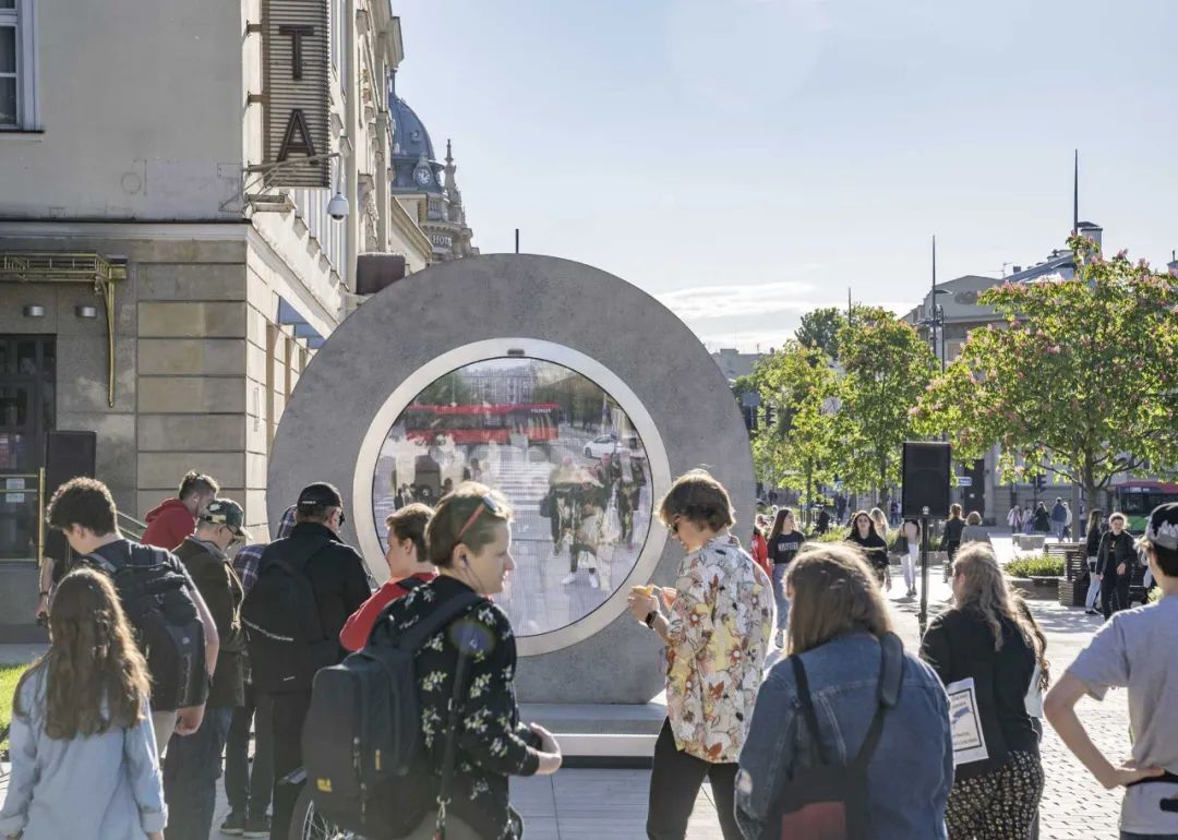 Portal是两个巨大的圆形装置,分别立于相距600公里的立陶宛维尔纽斯和波兰卢布林,实时传输两地视图,像一座桥梁,连接着两地的行人旅客。