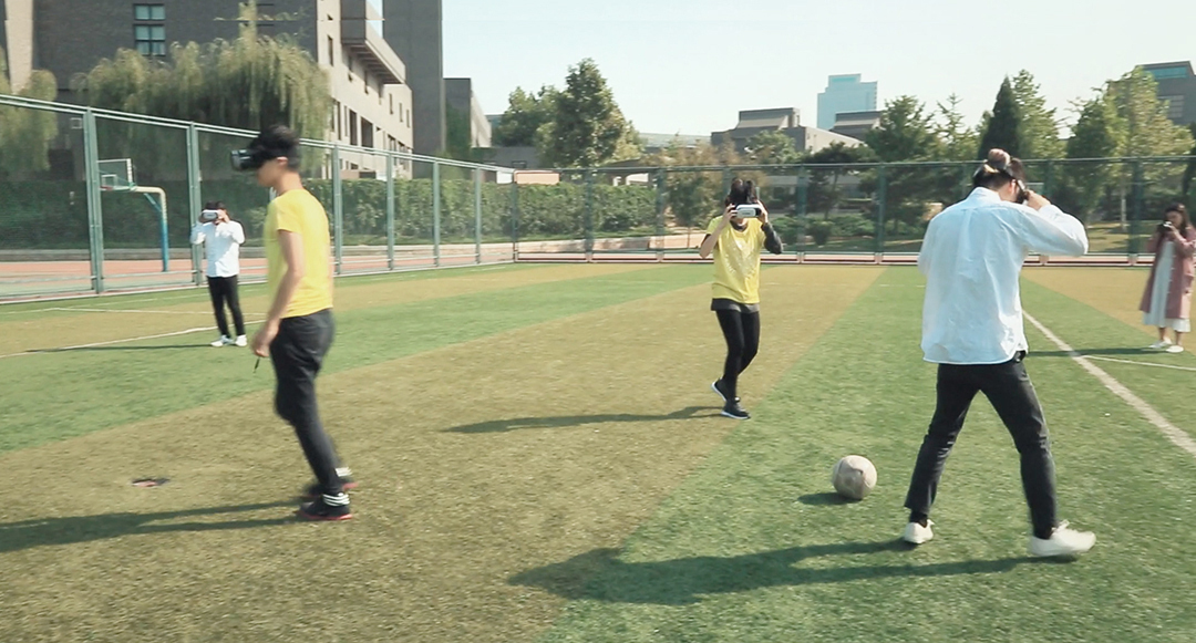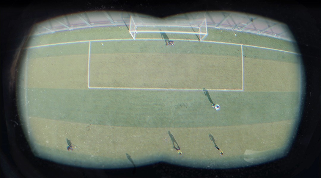 如果能用身体参与在一个二维的平面内进行游戏会如何?我用航拍仪在足球场上进行了一次这样的体验。将无人机垂直飞行于足球场上方,拍摄的画面直播传输到参与球员的眼镜里,球员用身体在屏幕中控制自己参与足球游戏