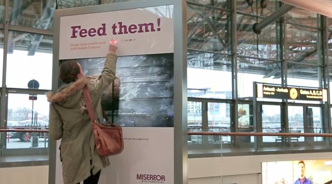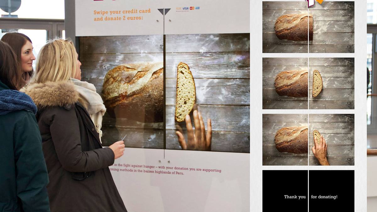 游客在这块互动广告牌前,只需滑动信用卡,就能为MISEREOR(德国米苏尔社会发展基金会)捐赠2欧元,并引发互动体验:解决温饱、拯救童工……