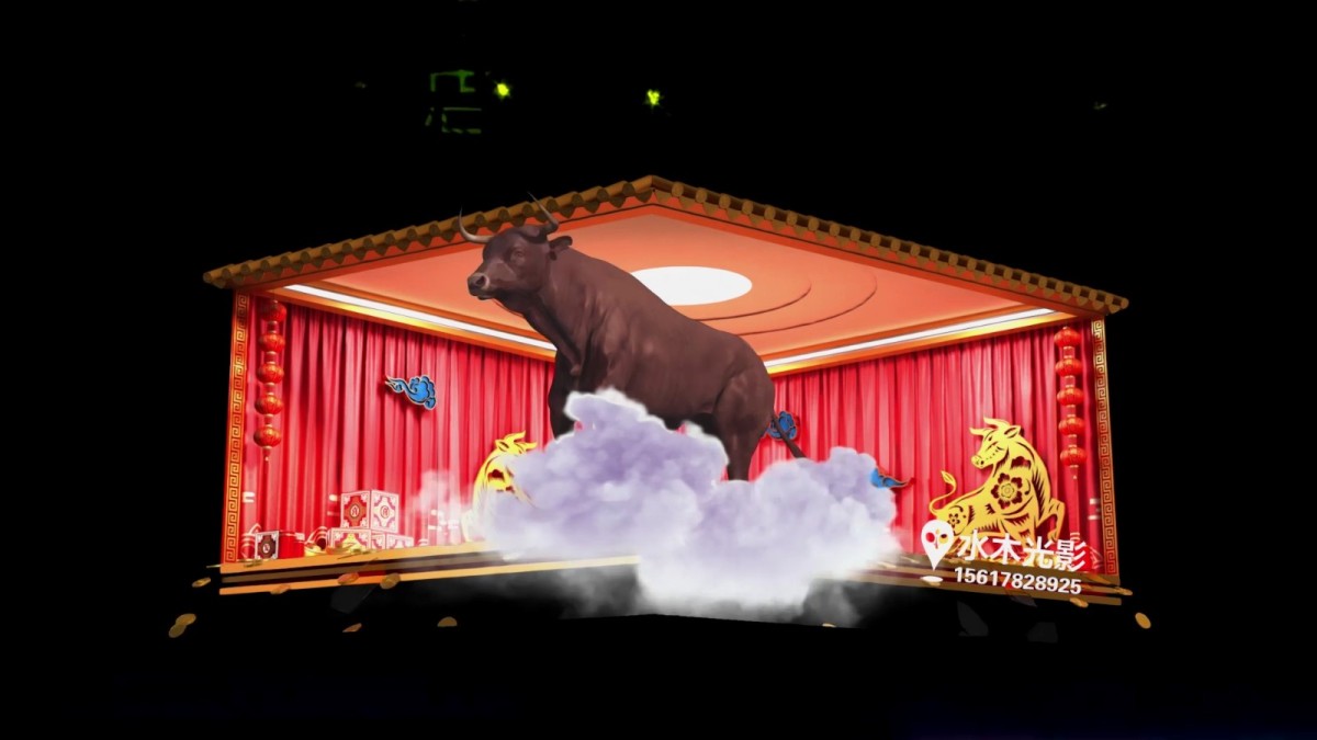 这是一个春节主题的裸眼3D演示,2021年在中国称为牛年,便有了这么一个牛气冲天的创意。牛冲破玻璃飞出大屏,3D效果很强,也有很浓的节日氛围。