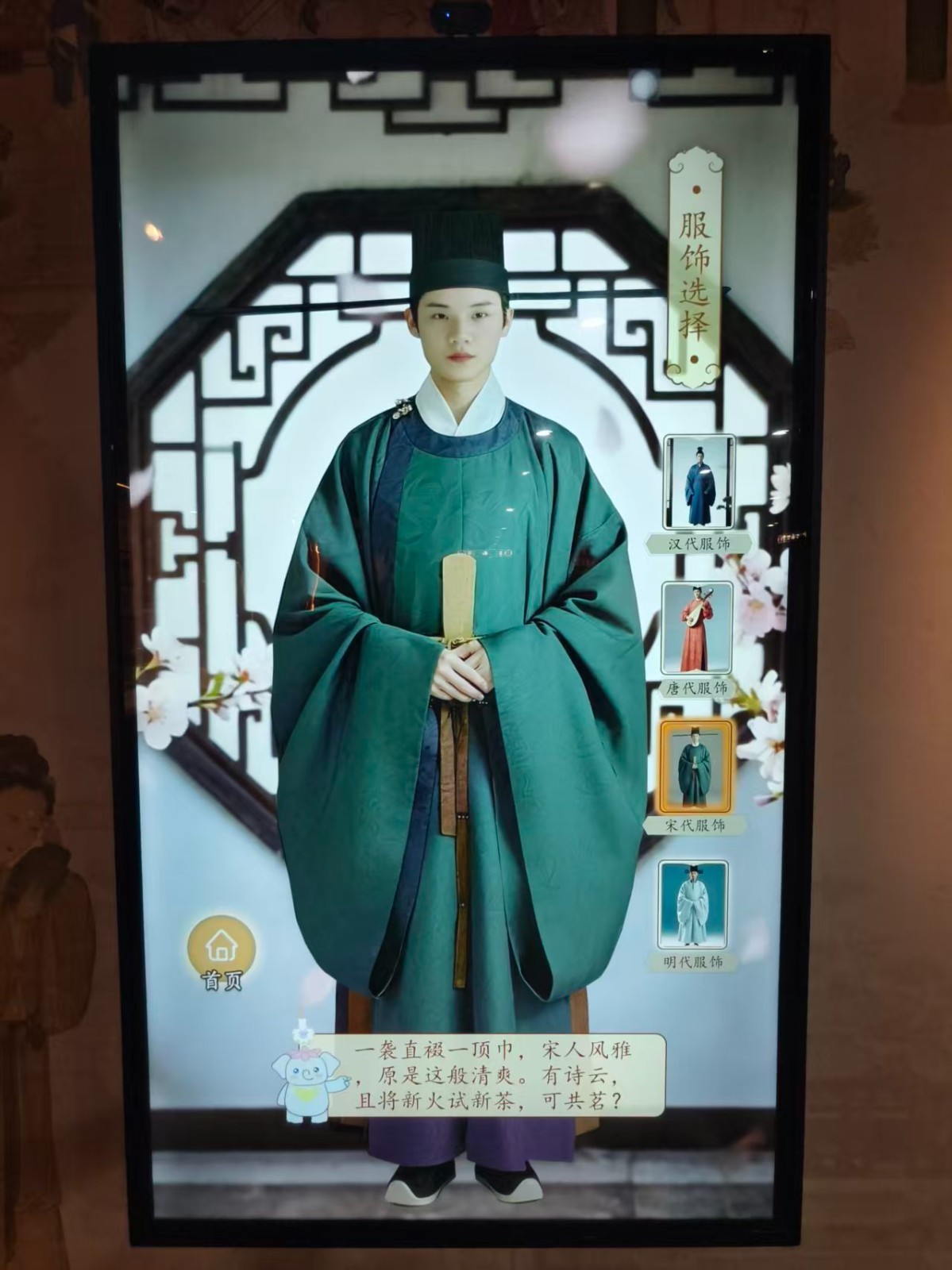 试衣镜可收录不同朝代的经典服饰样式,轻松挑选心仪的古服,一秒踏入历史画卷,亲身演绎古人的风雅日常。物理镜像延续"以镜正衣冠"传统;数字层叠加呈现历史服饰美学;虚实交融诠释服章文化传承