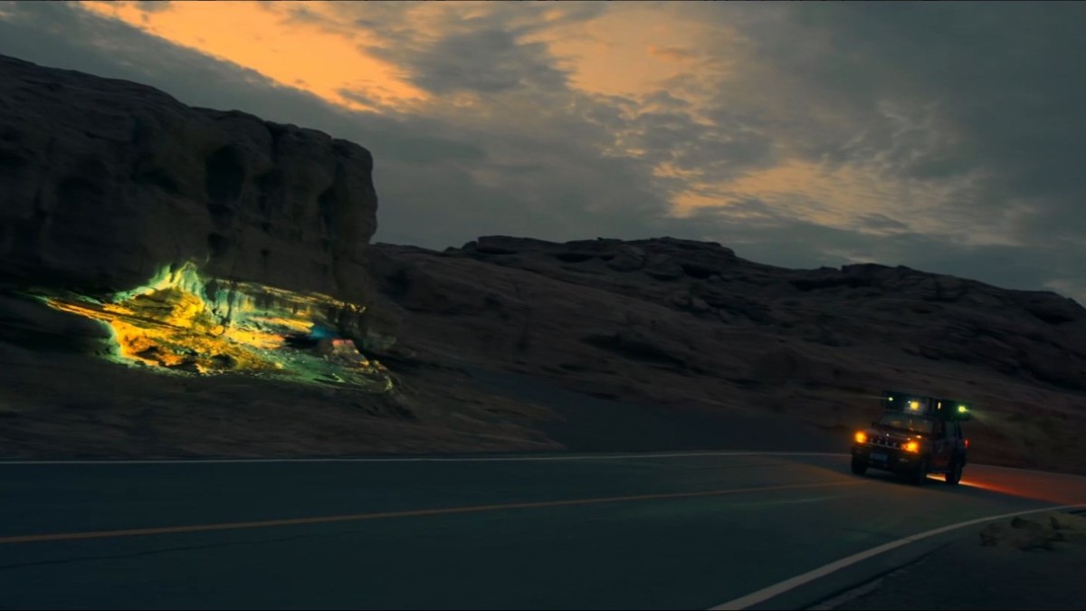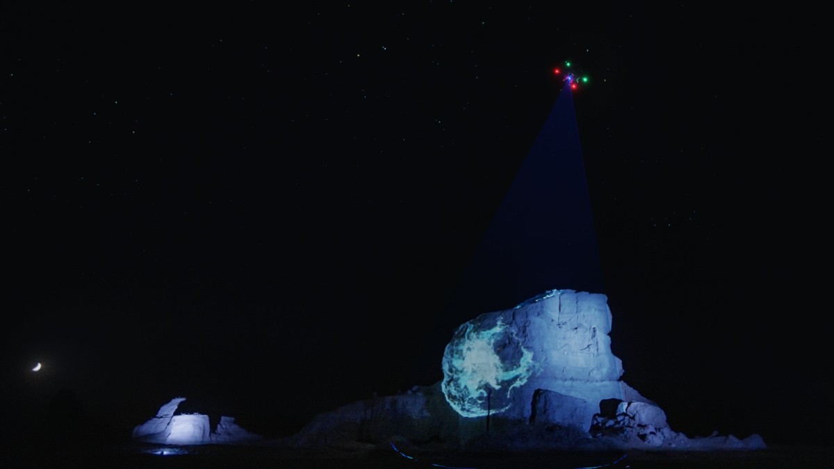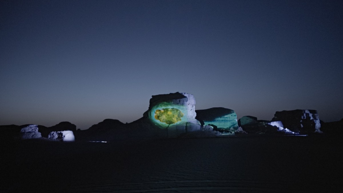2022年8月3日,“牧光计划”在雅丹国家地质公园进行了第一回的作品展演。郑靖与团队成员于7月26日抵达敦煌正式启动“牧光计划”。在为期5天的时间里,郑靖与团队以游牧行进的方式在敦煌地区勘测了5处地点,并根据空间条件选取了4处地点进行作品的创作与展演。经过2天勘测、2天准备,以及18个小时的昼夜测试,8月3日22点30分,距离敦煌市区168公里的雅丹国家地质公园迎来了历史上的首次公共空间艺术创作与展演,这也是雅丹地貌首次以与光影艺术相结合的形式面向世人。